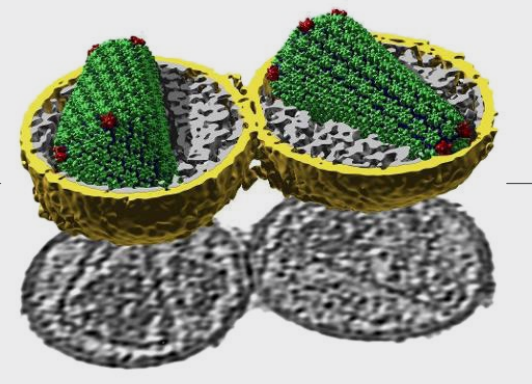 图. 来自完整灭活病毒的 HIV-1 包膜的冷冻电子断层扫描结构。(绿色和红色的 CA 蛋白结构构成了病毒基因组的锥形)4