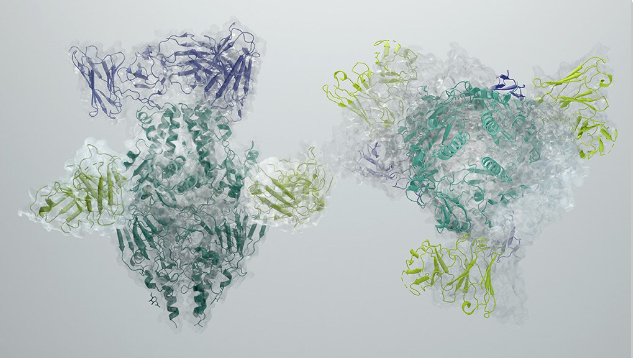 (三种包膜糖蛋白分别用黄色、蓝色和红色表示)3