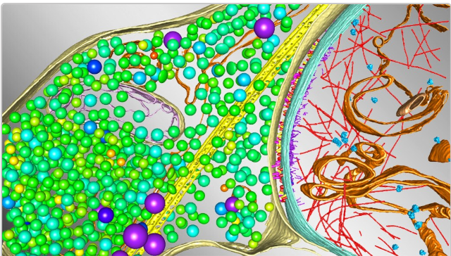 高尔基体是位于细胞核附近的一个细胞器,是细胞的主要分拣中心,在高尔基体内,蛋白质被修饰、分类和包装。将绿藻衣藻的高尔基体没有任何人工染色或固定剂速冻处理后,通过低温 FIB 研磨减薄,并使用冷冻电子断层扫描重建其高尔基体,实现莱茵衣藻高尔基体的 3D 可视化,这是低温电子断层扫描技术首次实现了对原生原位跨高尔基体网络的成像,而这种成像以前只能在体外进行,如视频所示。