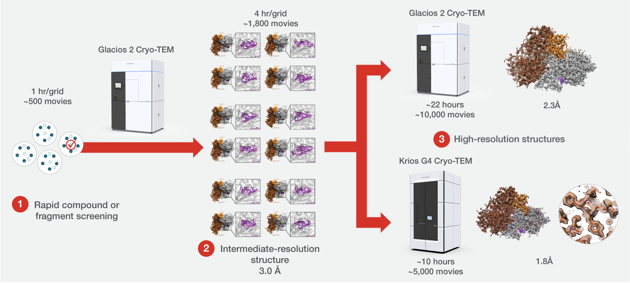 Glacios 2 Cryo-TEM冷冻电镜除了可用于Apoferritin (450 kDa)蛋白、GABAA (210 千倍铉)(Krios G4 Cryo-TEM冷冻电镜也可以观察)的观察外,还可以用于药物的发现。Glacios 2 Cryo-TEM可以准确、快速地以高分辨率可视化药物与大量样品的受体之间的相互作用,用于对基于结构的药物发现和设计;还可以作为高分辨率数据采集的独立工具,例如 2.3 Å 的 CAK,可以用作强大的筛选系统,以增强后续的 300 kV 分析。Glacios 2 冷冻透射电镜用于以每小时 ~1 个结构的速度测定二十多个 3.5-4.5 Å 激酶结构。这种方法大大提高了通量和生产率,优化了在更高分辨率 Thermo Scientific Krios Cryo TEM 上花费的时间,并确保仅针对最理想的样品收集最高质量的数据。这种方法有助于将冷冻电镜应用于基于结构的迭代药物设计,这对于应对一系列全球健康挑战变得越来越必要,通过使用 Glacios 2冷冻透射电镜和 Krios G4 冷冻透射电镜评估 CDK 靶向化合物的工作流程如下图所示。